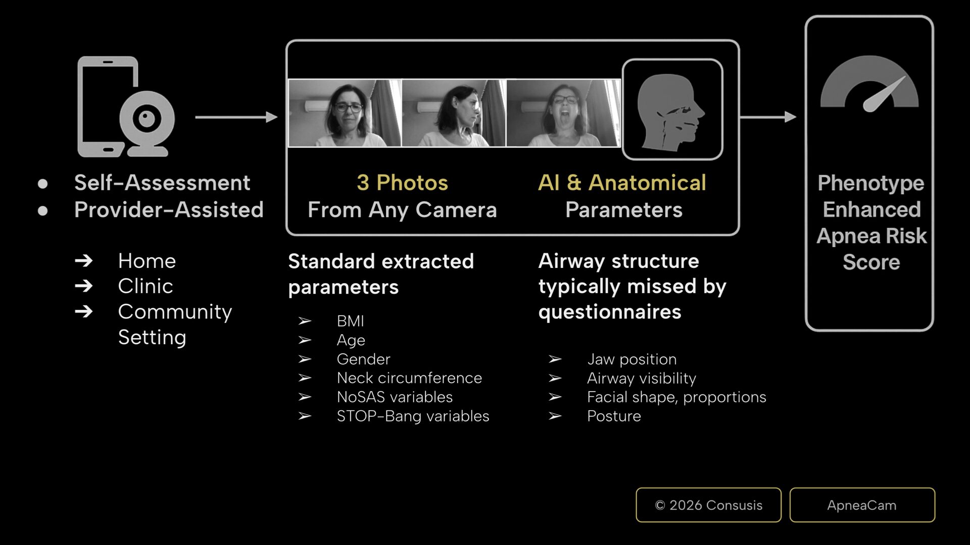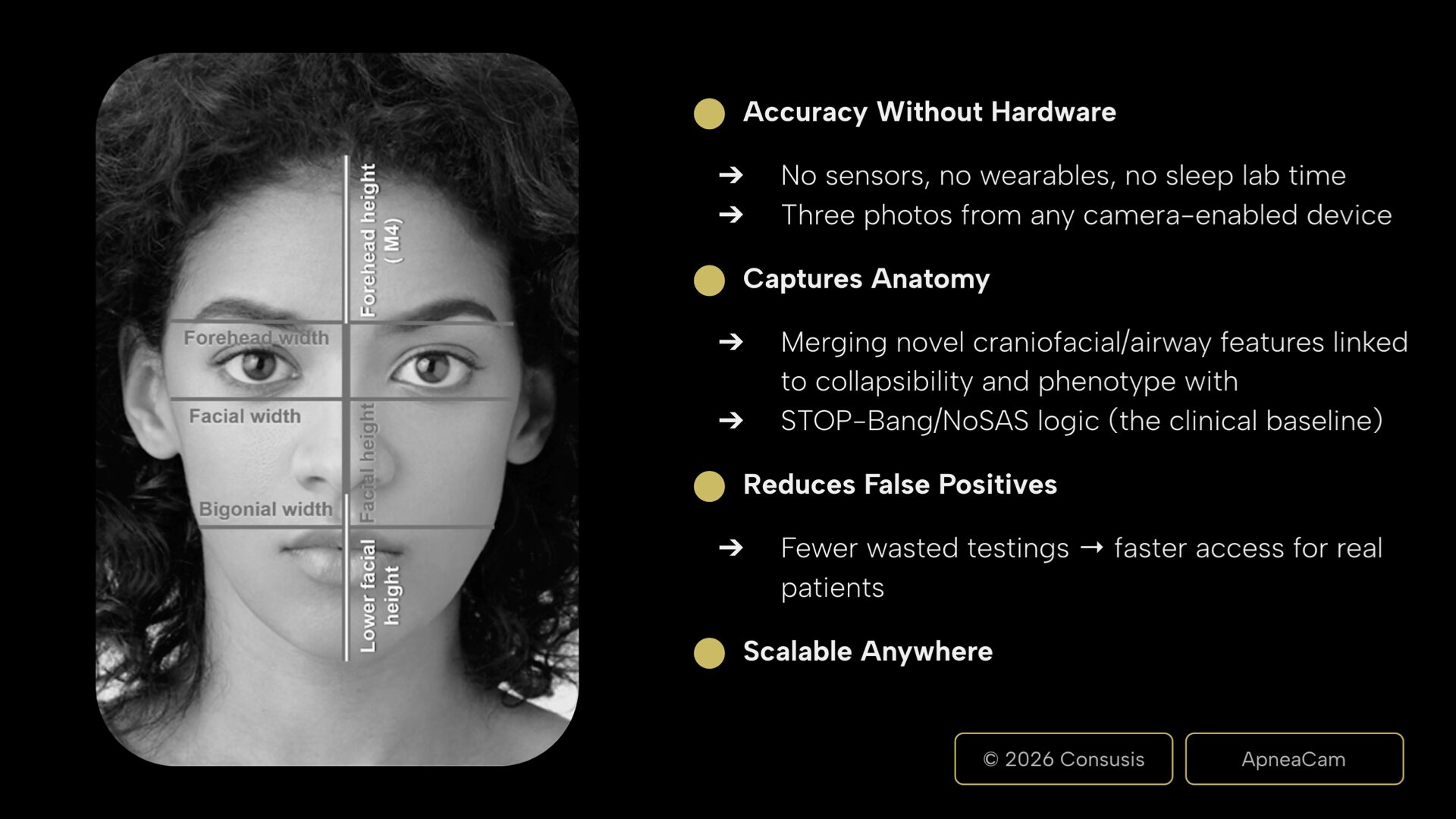 In just 10 seconds and with three photos from any camera-enabled device, Consusis empowers healthcare providers to identify sleep apnea in the 1 billion people affected worldwide. By enabling earlier diagnosis, our solution helps patients receive timely treatment before chronic health issues develop supporting proactive care across all economic and social demographics.
